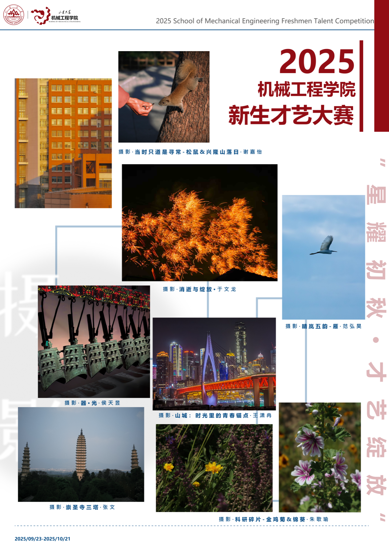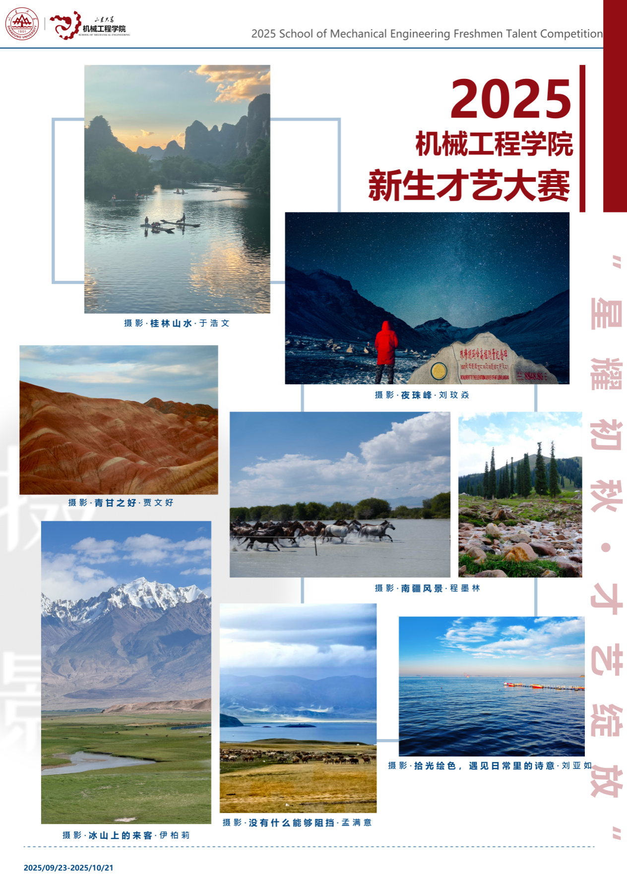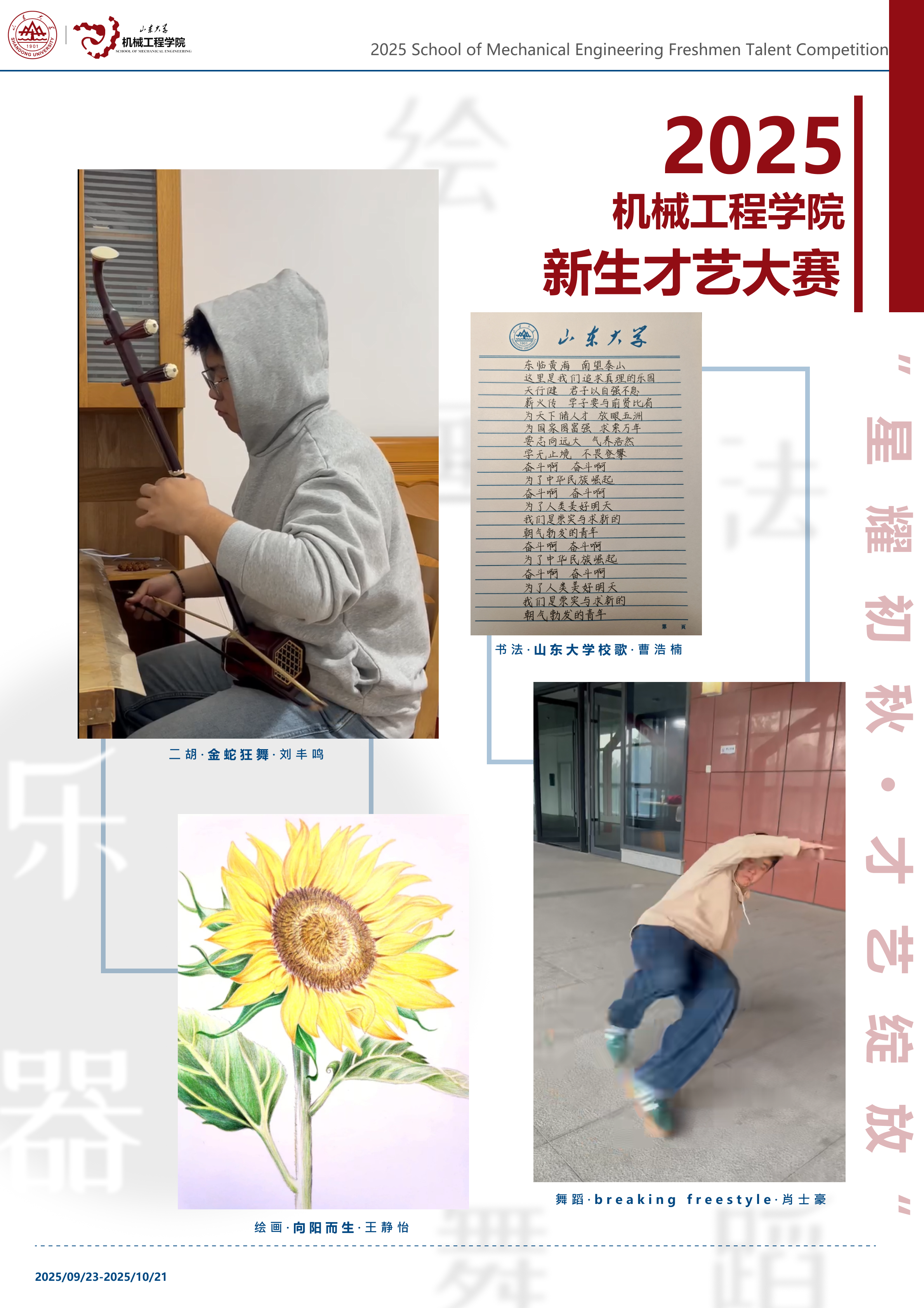 为展现2025级研究生新生的青春风采,山东大学机械工程学院在2025年9月23日至10月21日举办了新生才艺大赛。参赛同学以画笔描绘自然,以镜头记录美好,以舞步表达热爱,以书法传递情感,充分展现了机械学子积极向上、全面发展的精神风貌。本次展览作品涵盖绘画、摄影、书法、舞蹈、器乐等门类,内容丰富、形式多样,凝聚了同学们对生活的热爱与对艺术的追求。让我们共同欣赏同学们的精彩创作,感受青春的力量与机械工程学院的文化魅力。