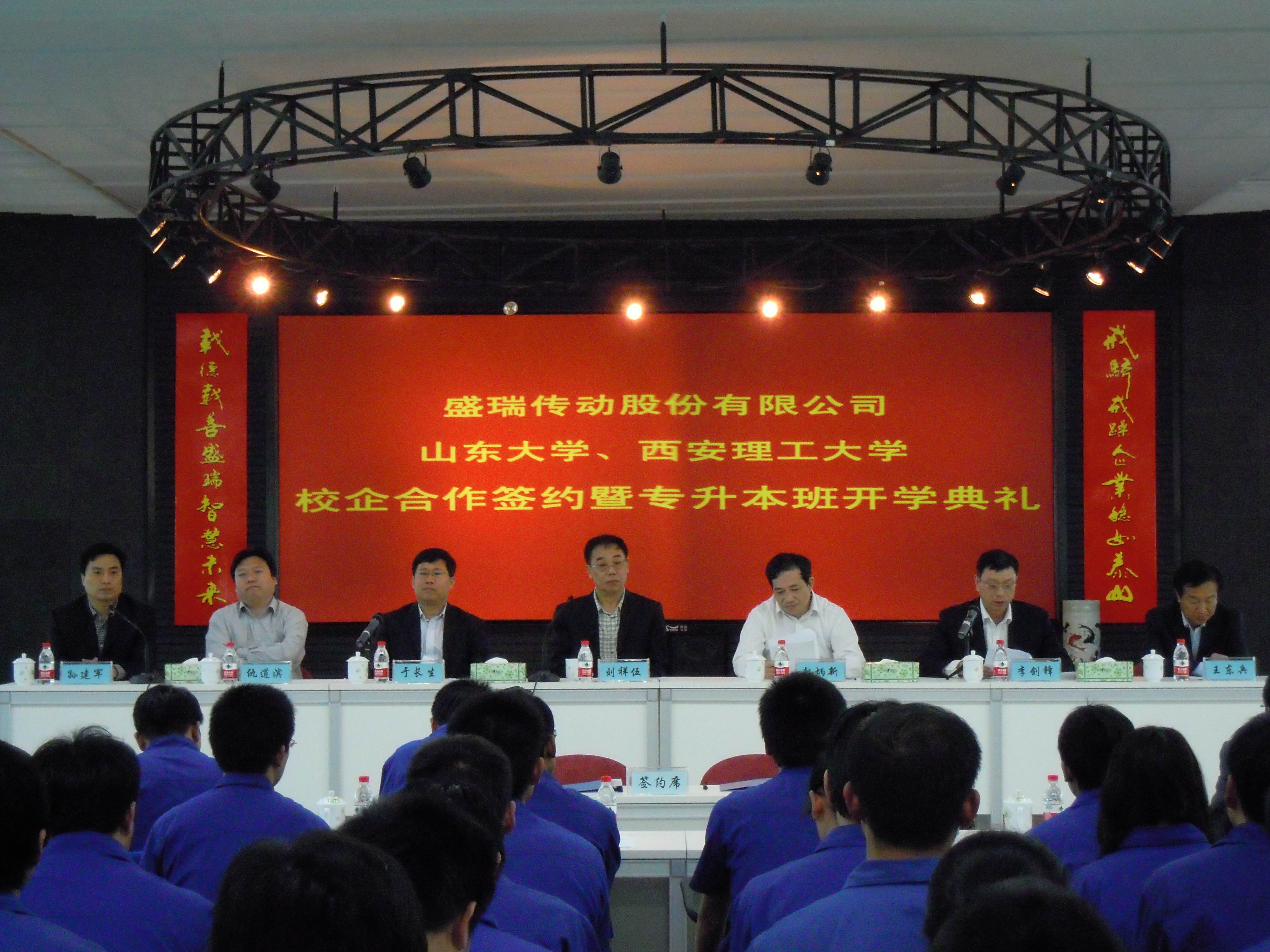 近日,山东大学机械工程学院与盛瑞传动股份有限公司校企合作签约及山东大学机械电子工程专业函授本科班开班典礼在潍坊市高新区盛瑞传动公司8AT新工厂一楼大厅隆重举行。山东大学继续教育学院院长、博士生导师赵炳新教授,山东大学机械工程学院院长、博士生导师李剑峰教授,盛瑞传动股份有限公司董事长兼总经理刘祥伍博士等合作双方相关负责人及培训班全体学员参加了典礼。